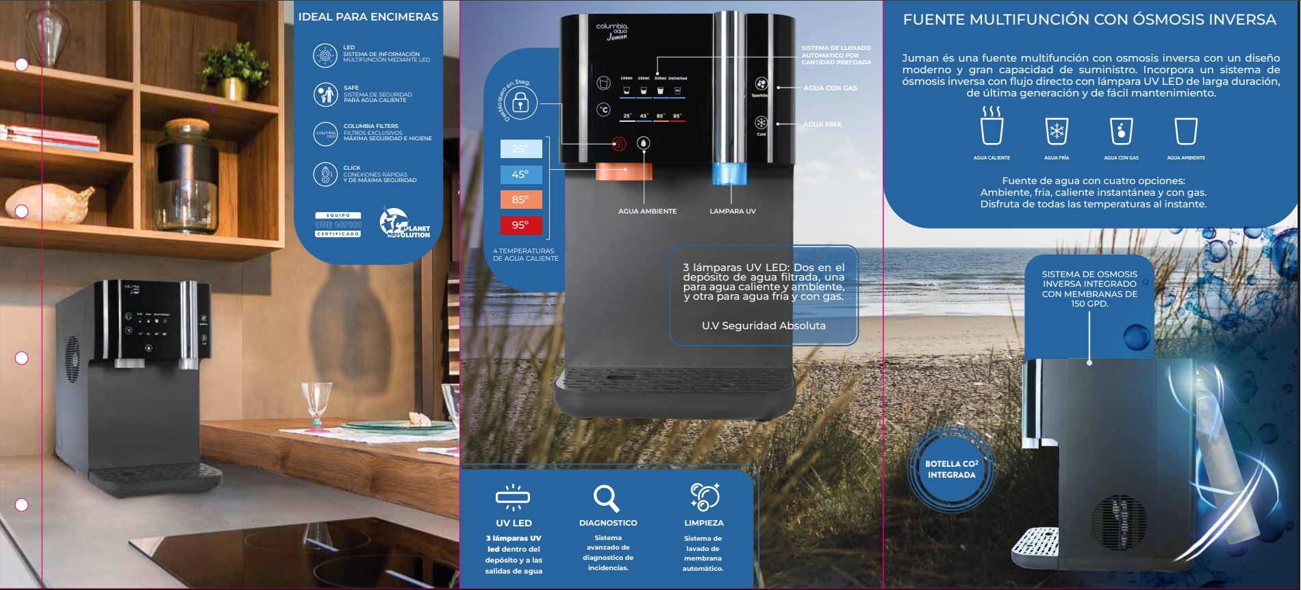 La calidad del agua es primordial con la Columbia Aqua JUMAN. Este dispensador asegura que el agua se sirva en su punto óptimo, conservando todos sus componentes beneficiosos para el organismo. Disfruta de un agua fresca y revitalizante, ya sea para un té caliente, una bebida fría o un vaso de agua con gas, todo con la comodidad de tenerlo al alcance de la mano. Con JUMAN, la hidratación se convierte en un placer instantáneo.
